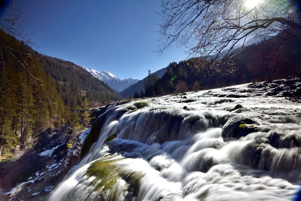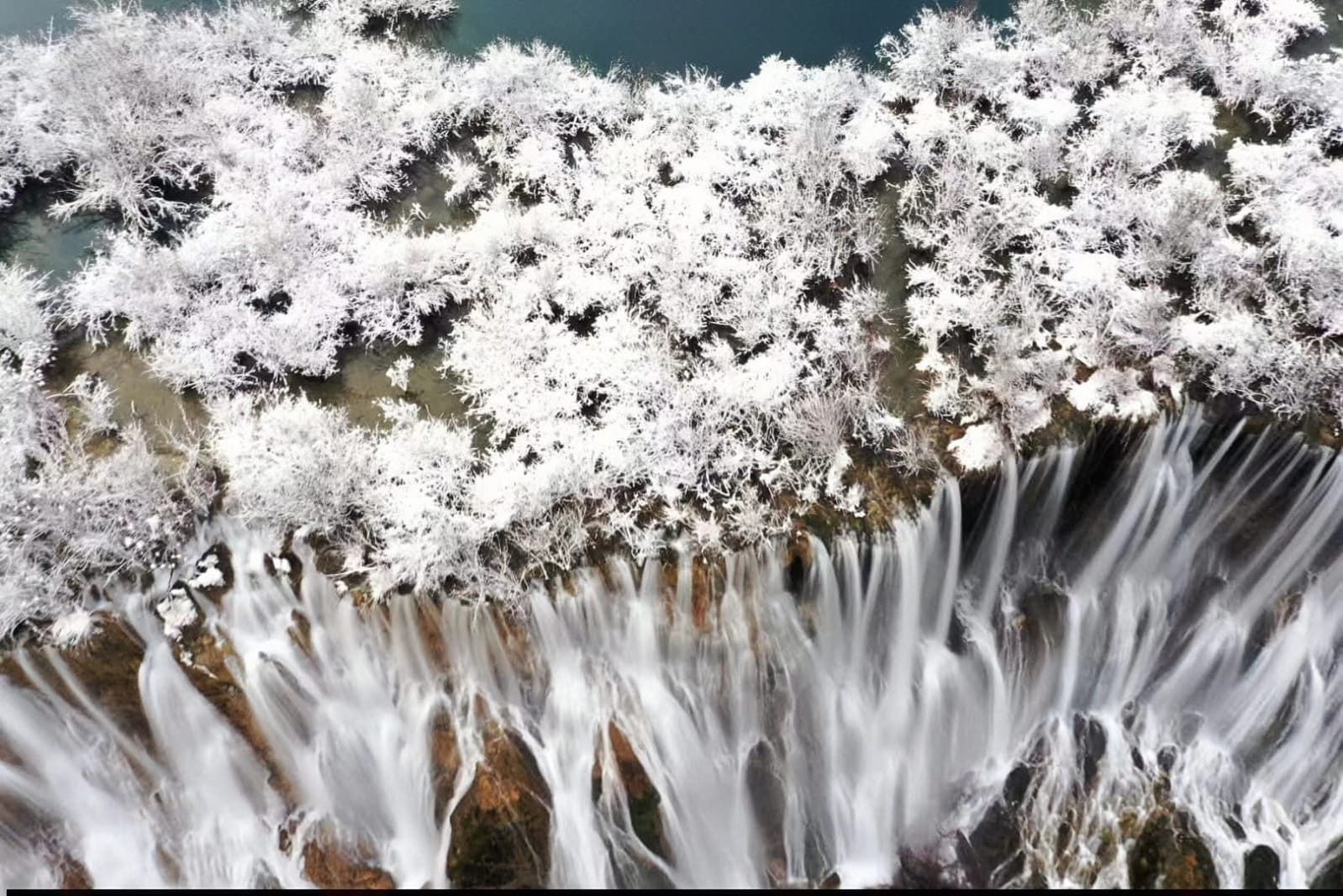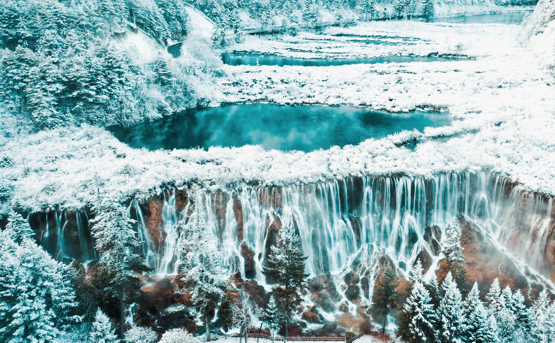 冬季的九寨溝珍珠灘瀑布依然壯觀,雪水融化形成的瀑布水色泛白,水流湍急。 雪後的珍珠灘呈現「銀裝素裹」的浪漫景觀,遊客可沿著棧道觀賞瀑布的氣勢磅礡。