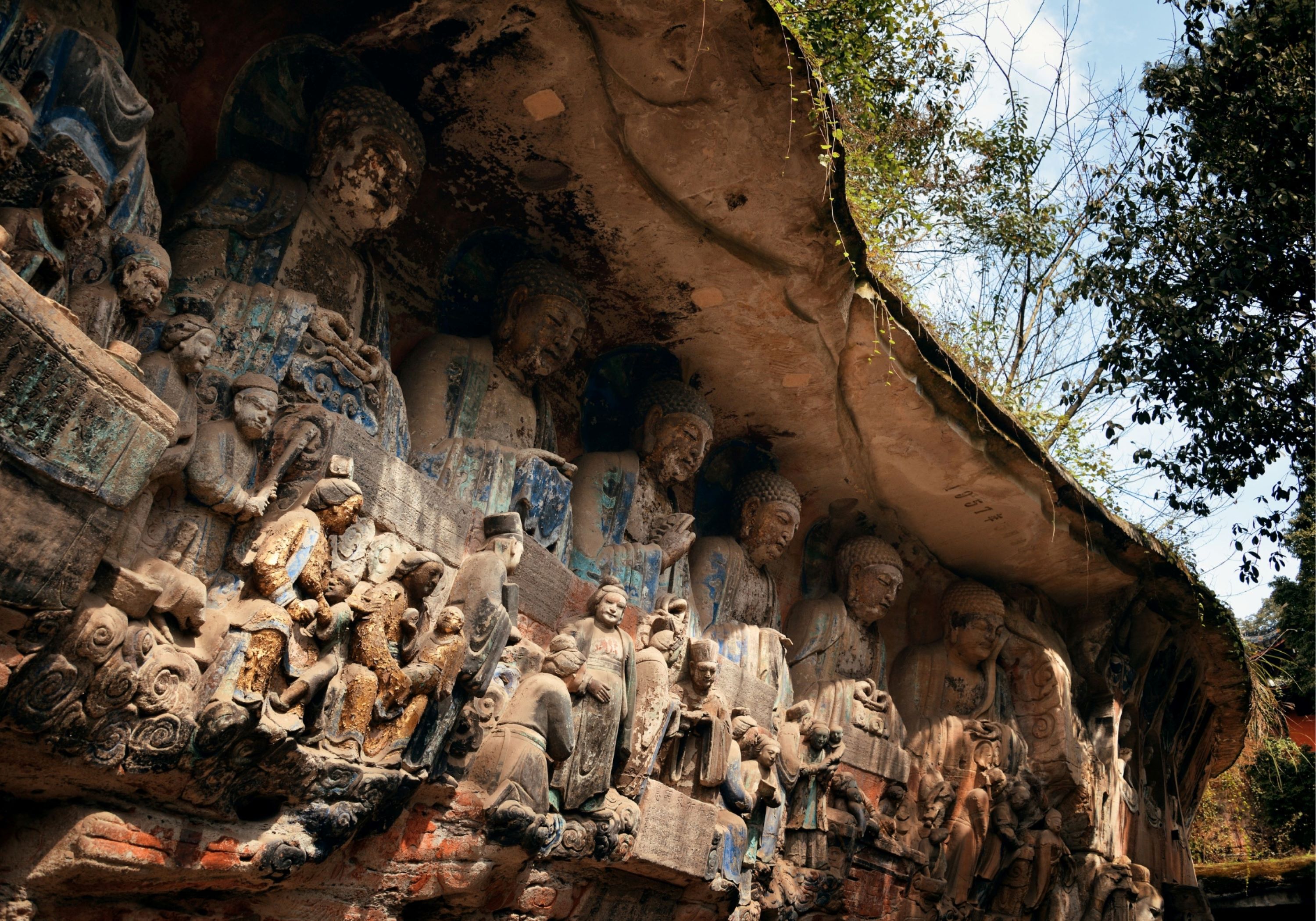 唐末宋初時期的摩崖石刻,以佛教題材為主,其中以寶頂山摩崖造像和北山摩崖造像最為著名。 大足石刻是中國著名的古代石刻藝術,1999年被列為世界文化遺產,其組成部分寶頂山摩崖造像、北山摩崖造像於1961年分別入選全國重點文物保護單位。