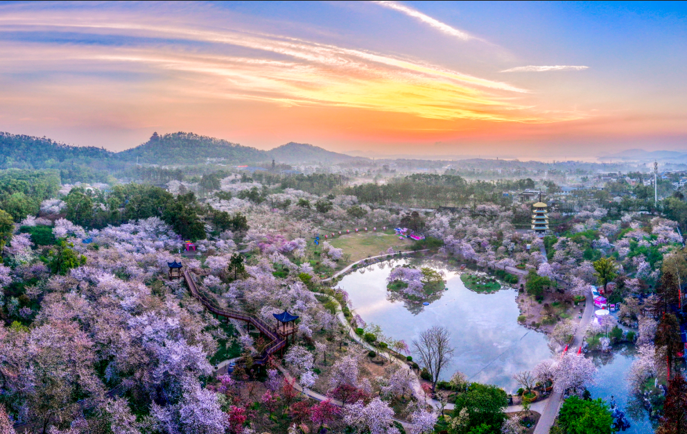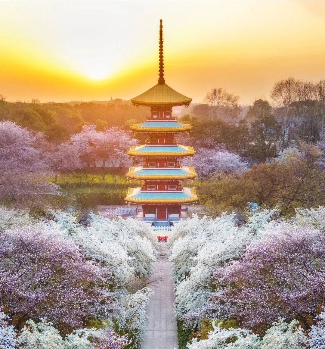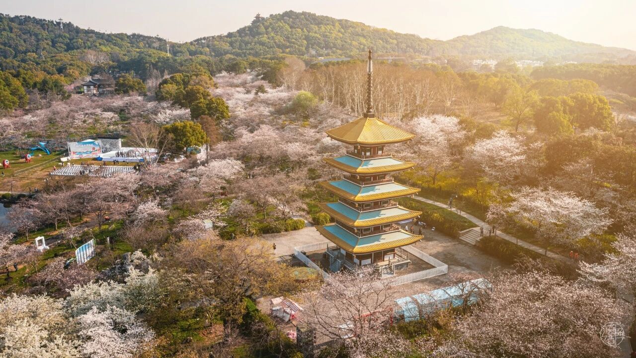 中國最大的櫻花專類園之一。每年三月,上萬株染井吉野、垂枝櫻等品種依湖畔坡地漸次盛放,粉白花海與碧水、古塔、曲橋相映如浮世繪卷。