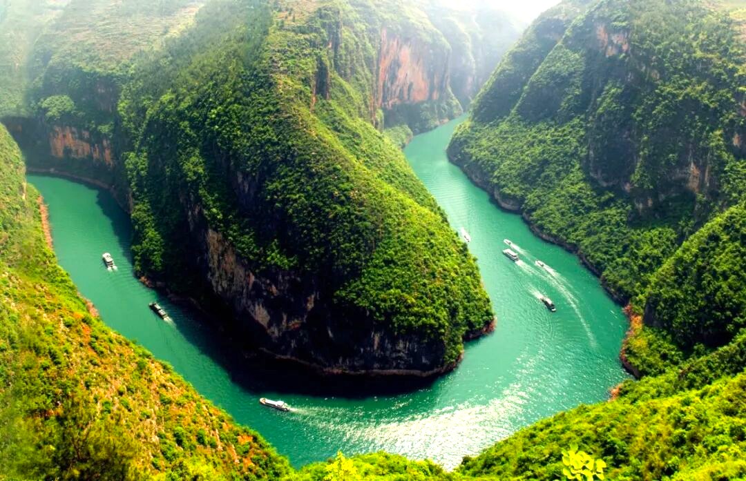乘坐觀光船遊覽「巫山小三峽」的美景。乘船穿行於險峻的峽谷之間,清澈的水面映照著藍天白雲,宛如進入了童話世界。換乘小船進入「小小三峽」,兩側是令人驚嘆的懸崖峭壁,下方湍急的河水沖擊著巖石,宛如一幅潑墨山水畫。