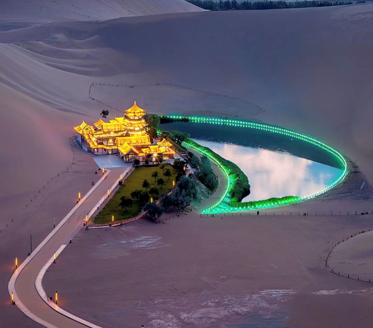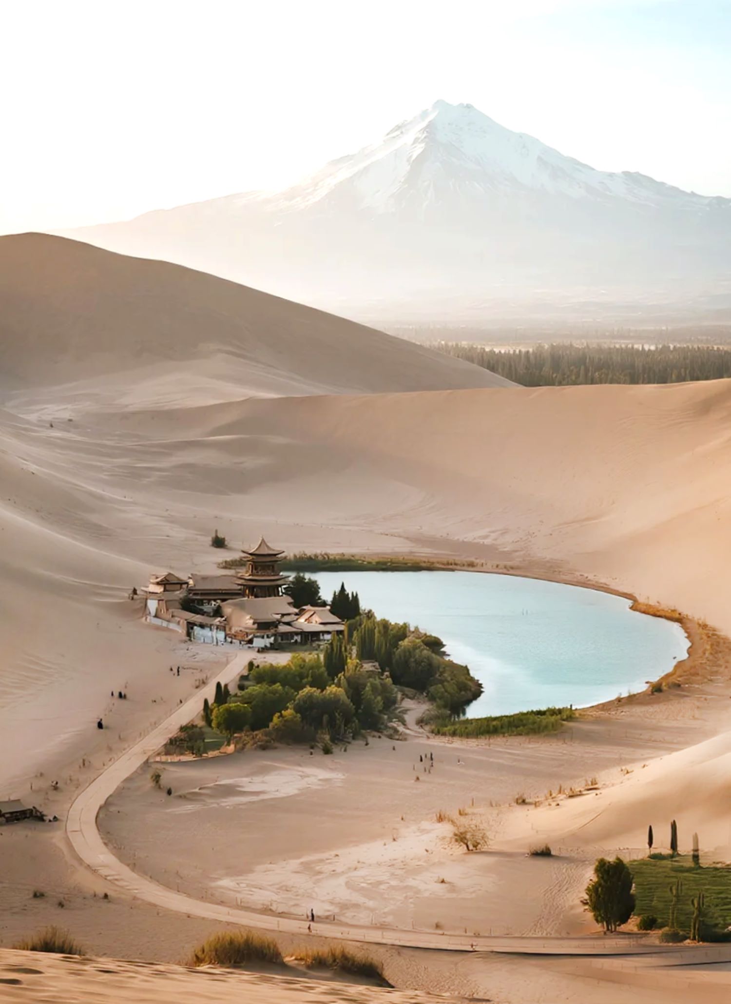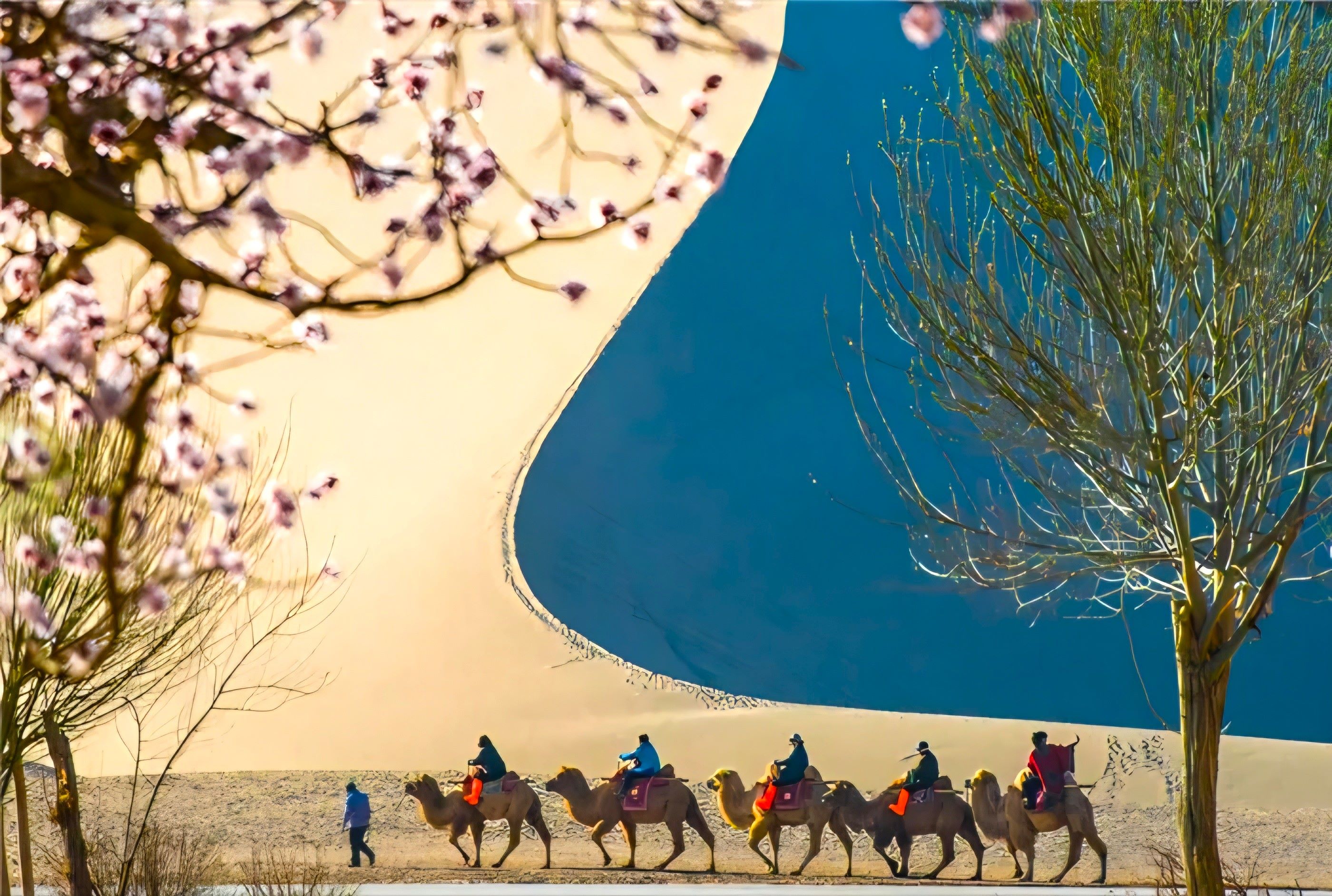 鳴沙山被譽為塞外風光之一絕。2005年獲“中國最美的五大沙漠之一 ”榮譽稱號。月牙泉處於鳴沙山環抱之中,其形酷似一彎新月而得名。