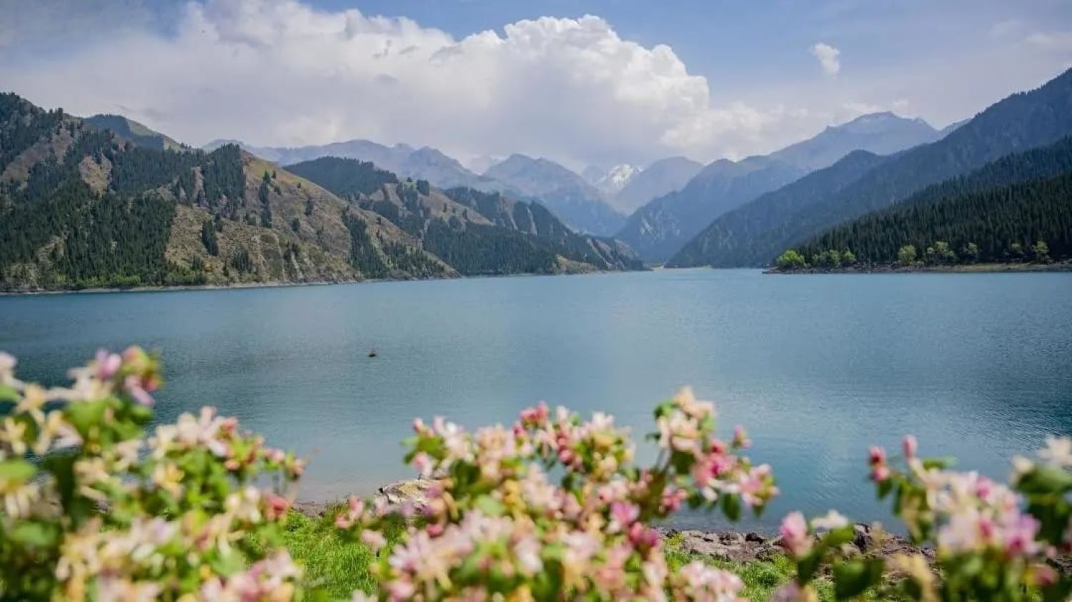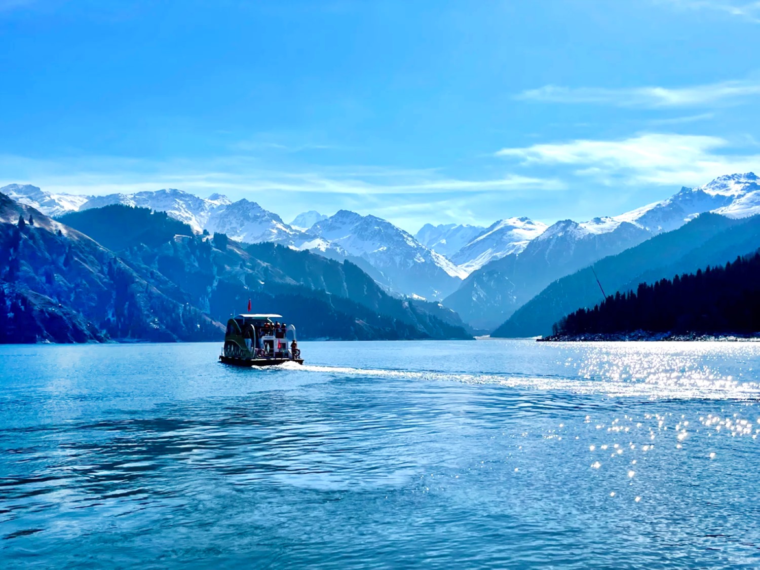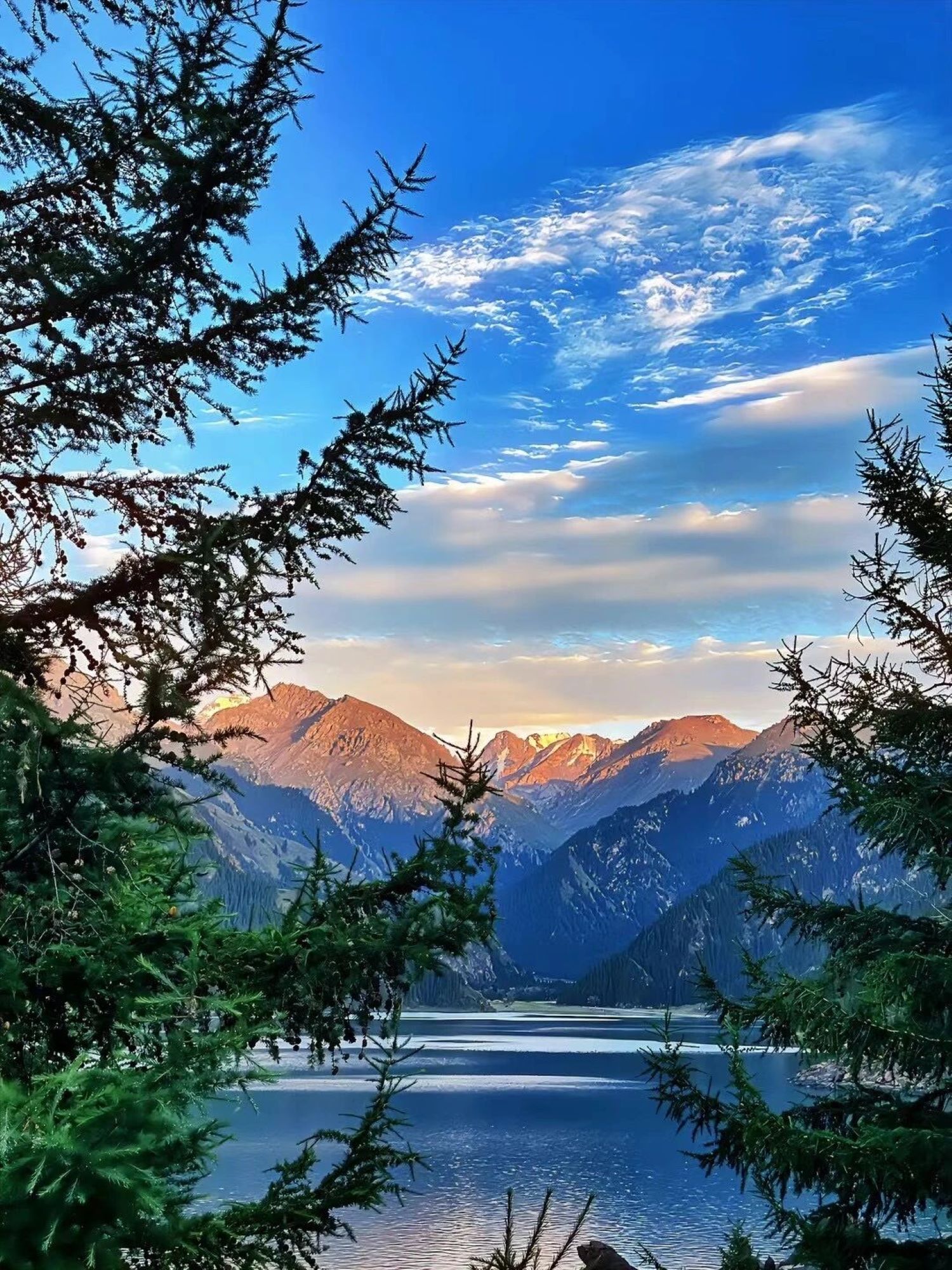 天池古稱「瑤池」,傳說為西王母沐浴之地,湖水終年不凍,清澈如鏡,四周群山環抱,雪峰倒映其中,被譽為「天山明珠」。