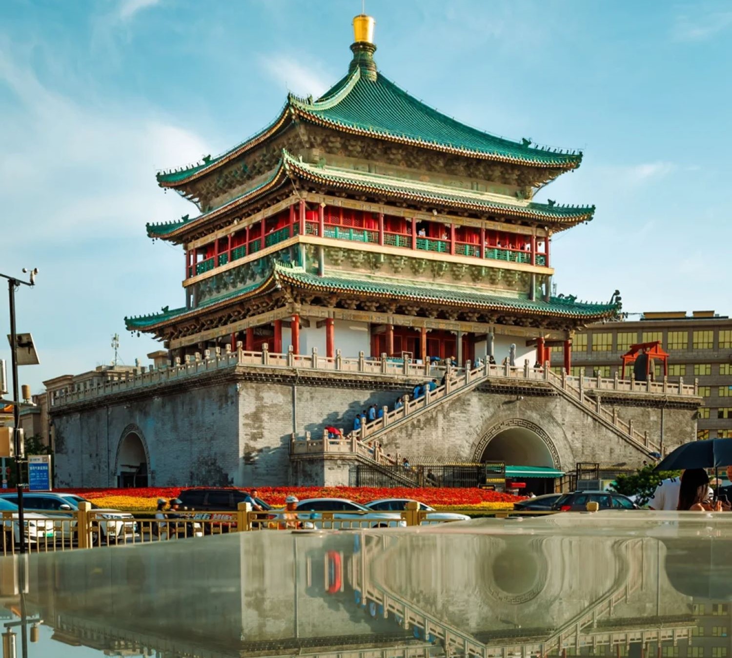 西安鐘鼓樓廣場位於東西南北四條大街的交匯處,廣場東側屹立着有六百多年歷史的鐘樓,西側屹立存在全國最大的鼓樓。