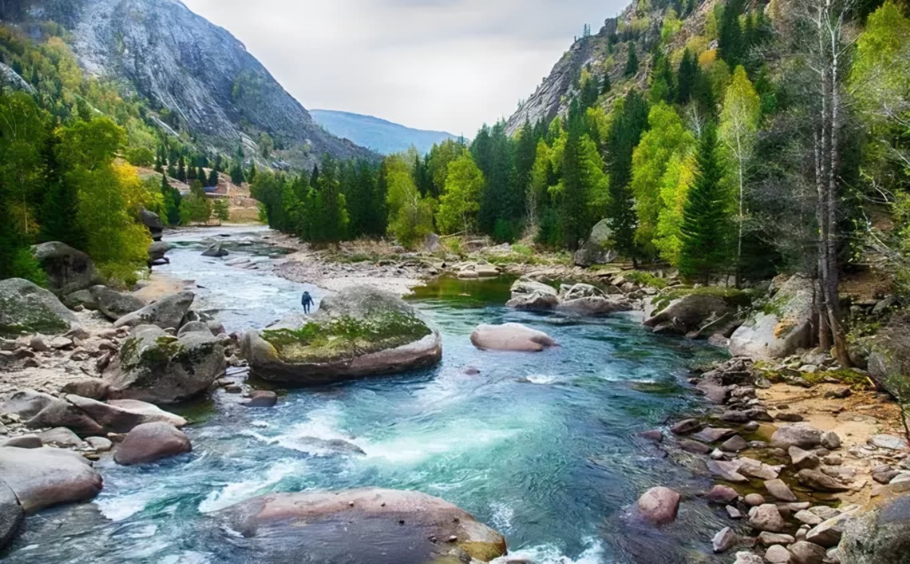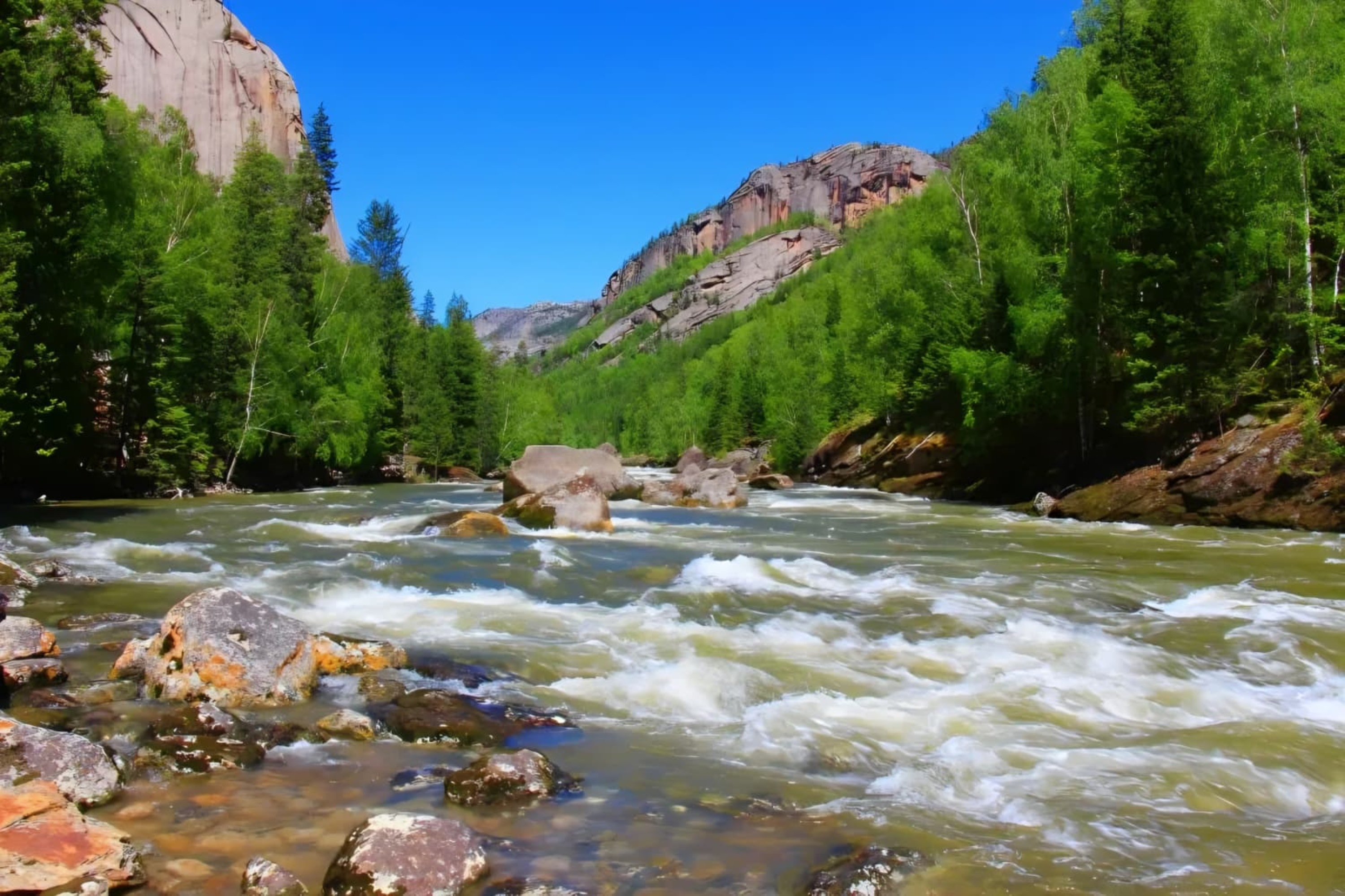 額爾齊斯河上游的階梯瀑布群。水流沿花崗岩壁逐級飛瀉,夏季奔騰,冬季凝結成冰瀑,四周森林環繞,景致清幽壯麗,是公園內重要的水文與觀景地標。