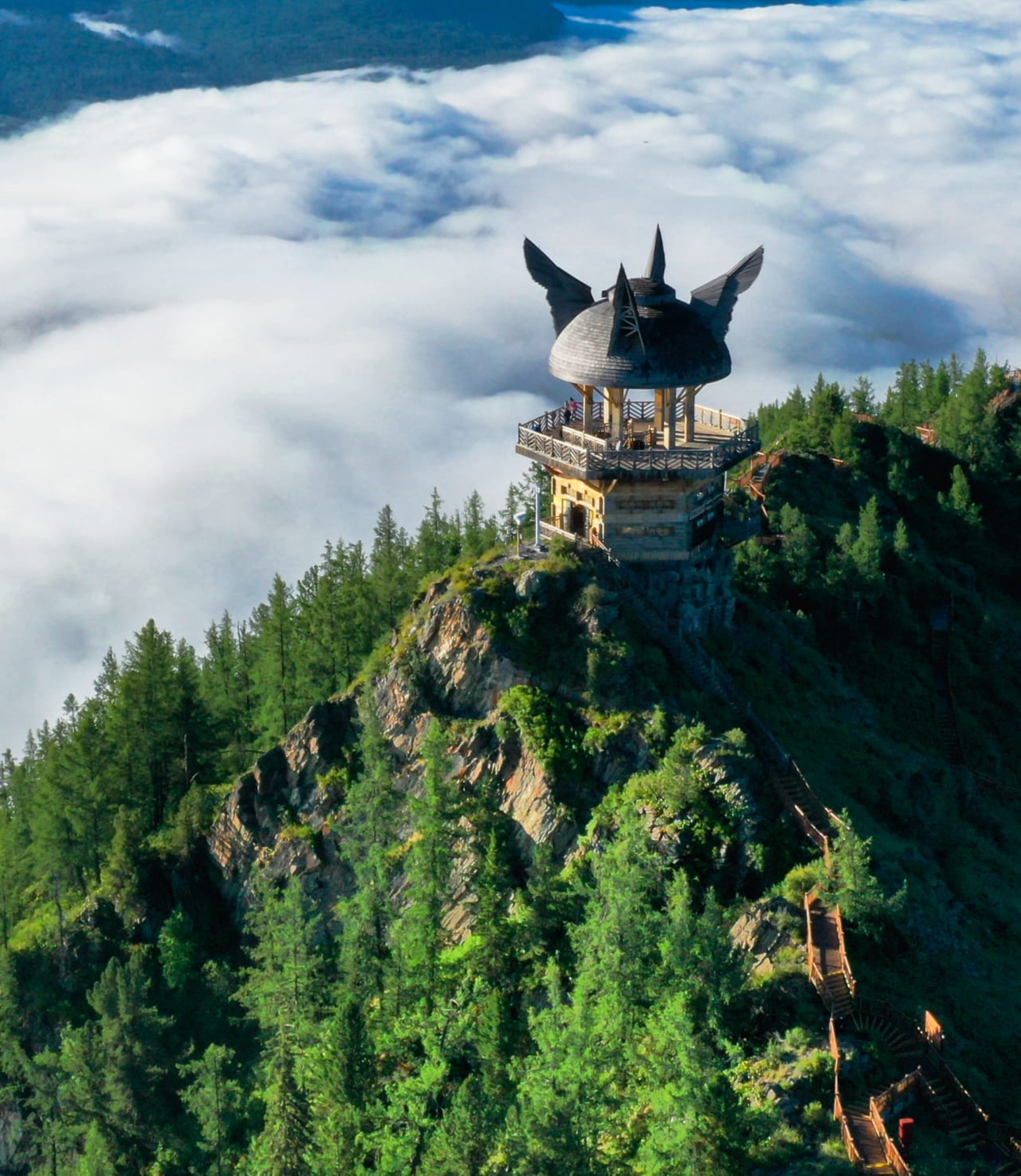 可觀看喀納斯湖的整體美景。湖面呈綢緞般光滑平靜,宛如一塊色彩斑駁的翡翠鑲嵌在山谷之間,並向下遊河谷蜿蜒流淌,波光閃耀,飄散着童話般的色彩。
