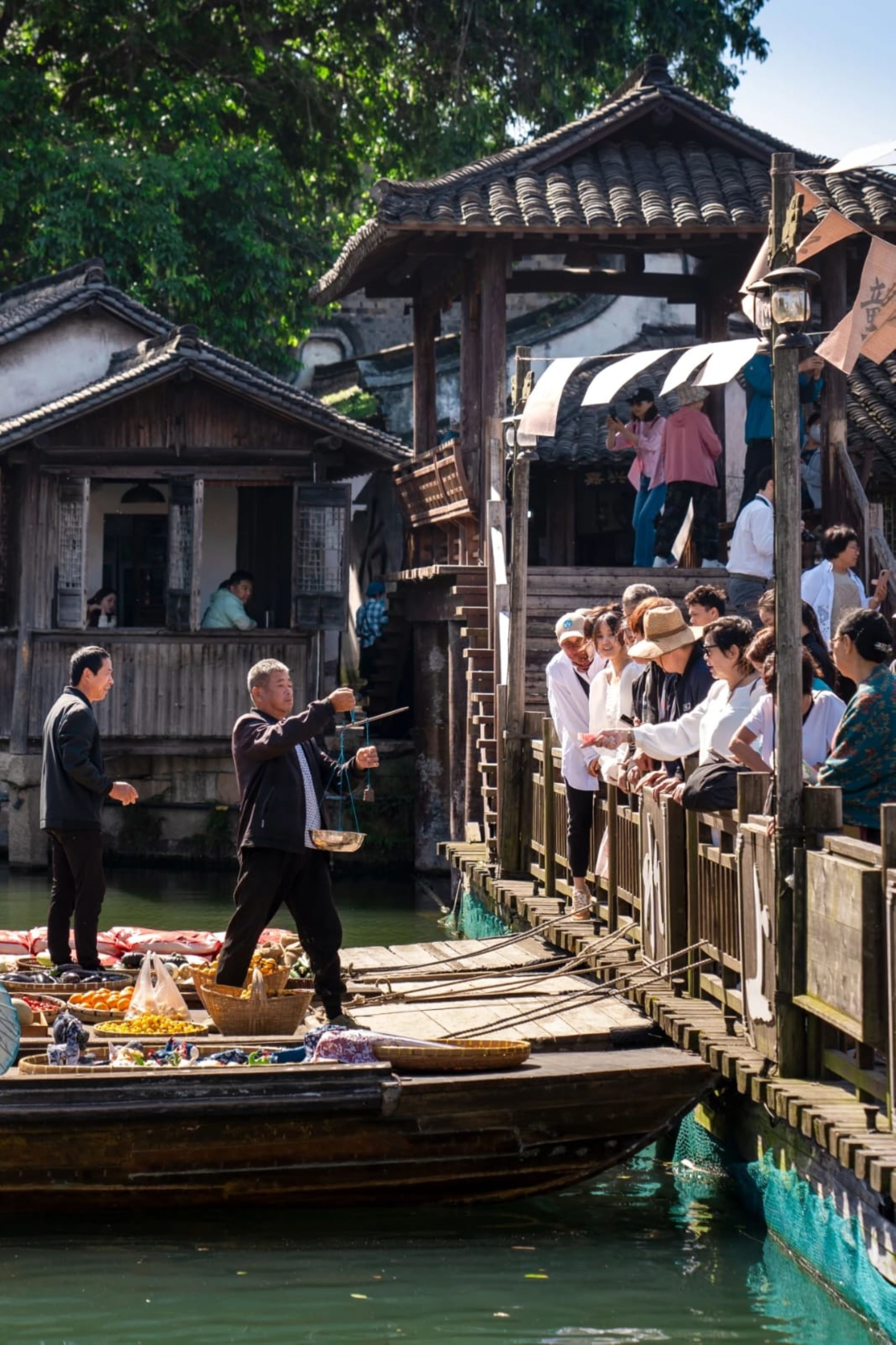 清晨的水上集市,是烏鎮一日生機的開始。船隻載著鮮蔬魚貨,在縱橫水巷中穿梭交易,市聲、搖櫓聲與談笑聲交織,重現了江南「以船為車,以楫為馬」的傳統生活縮影。